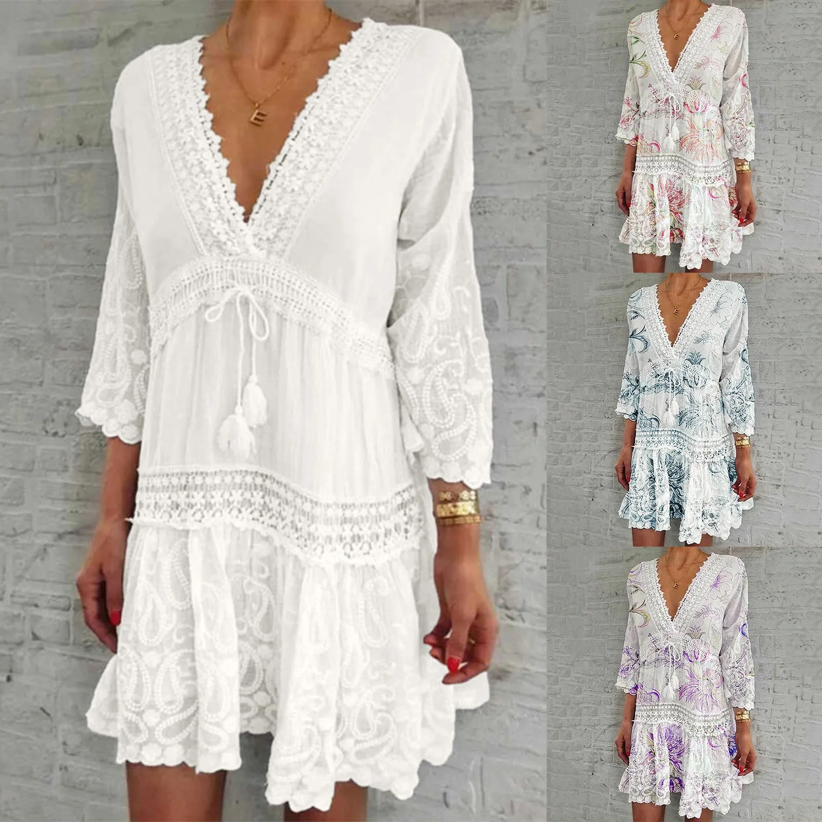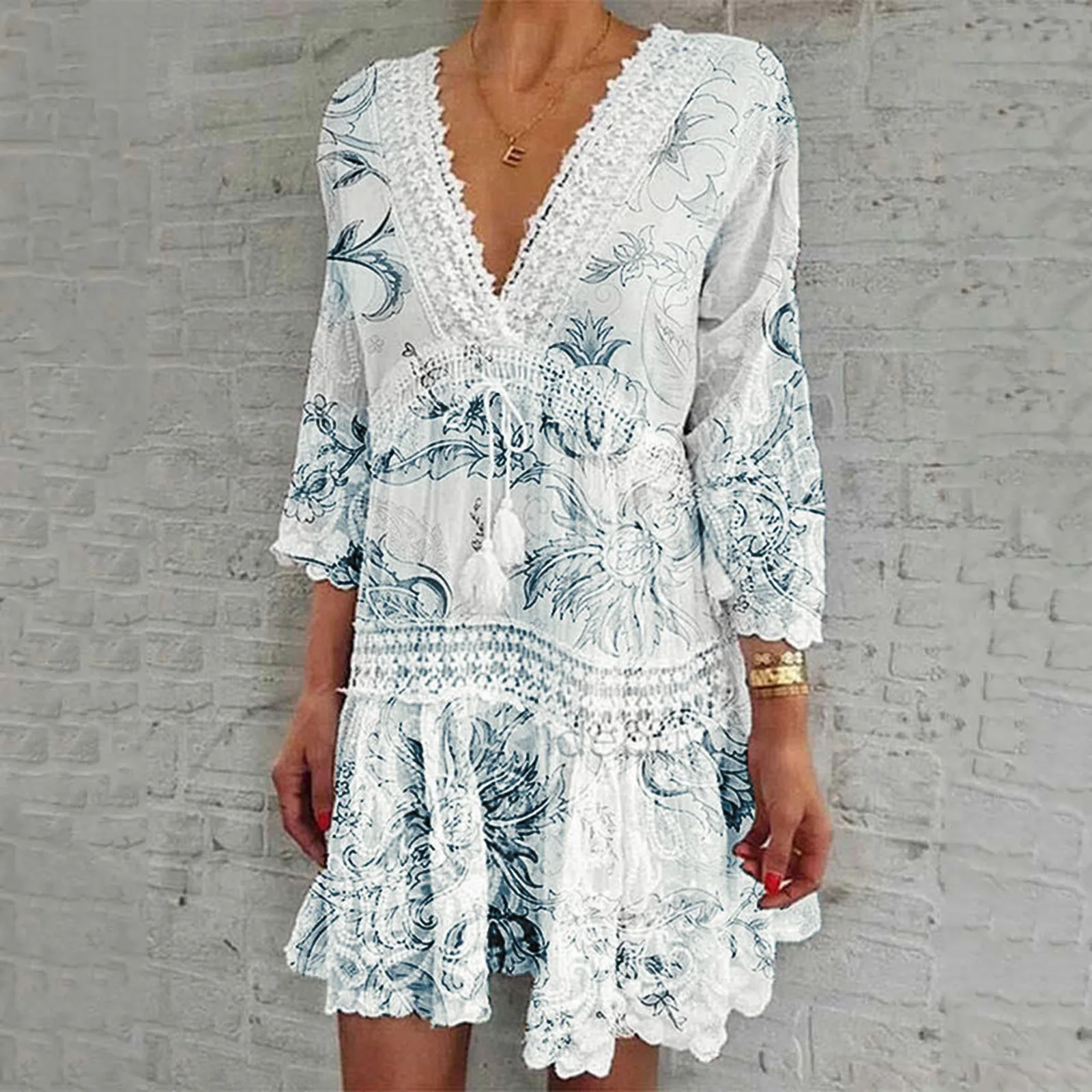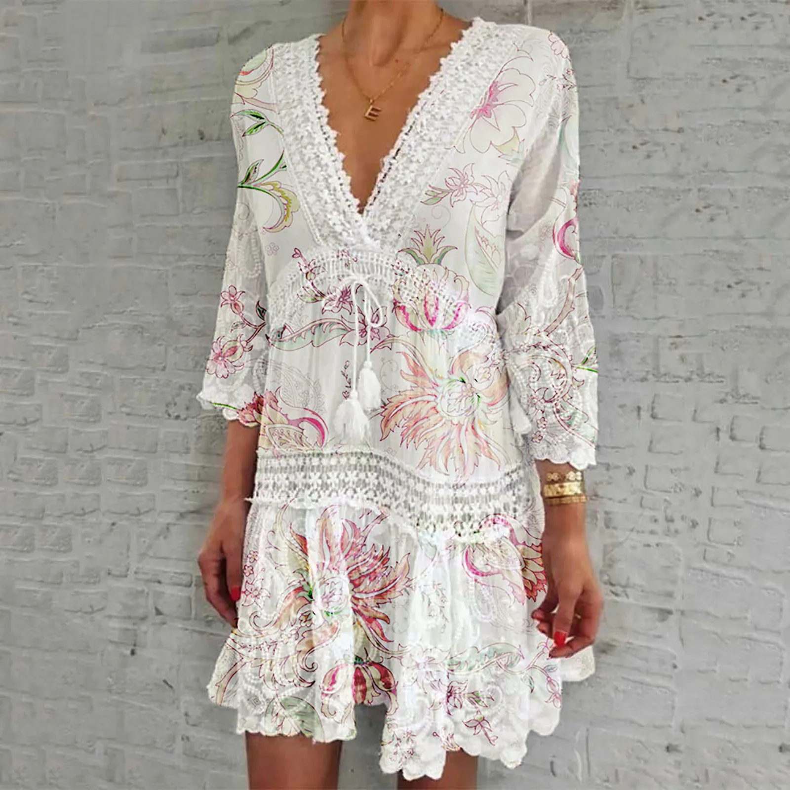 Women Fashion V NeckJjacquard Seven Quarter Sleeve Bohemian Cutout Floral Sexy Beach Dress