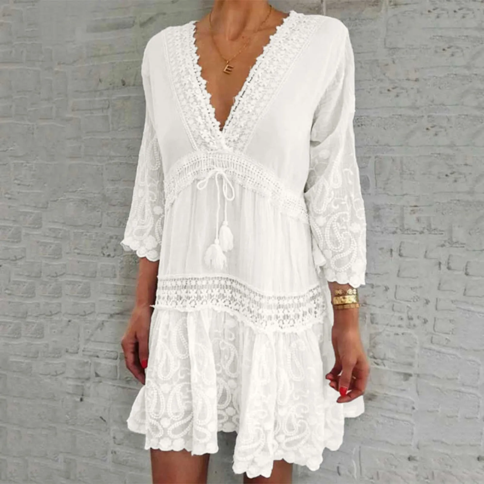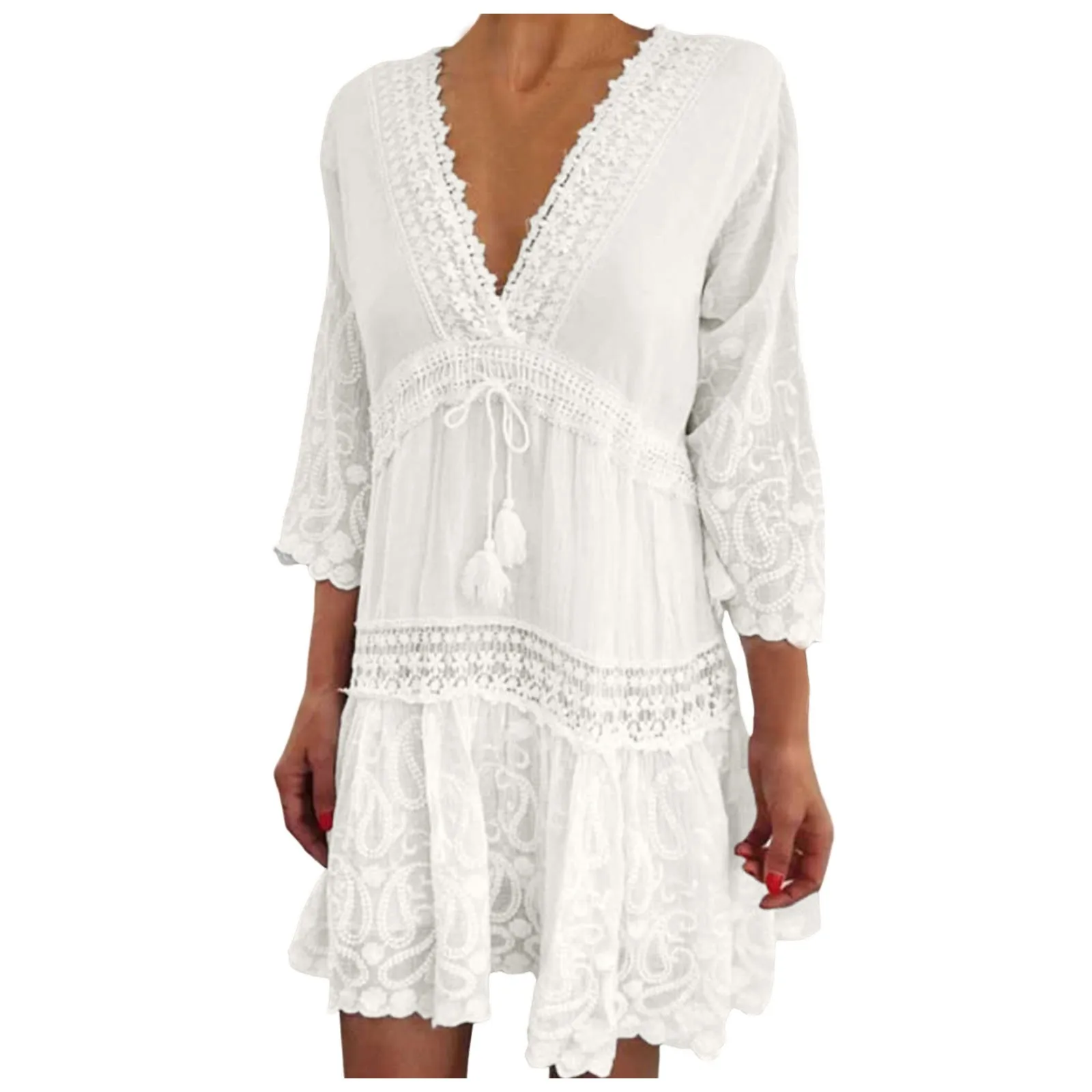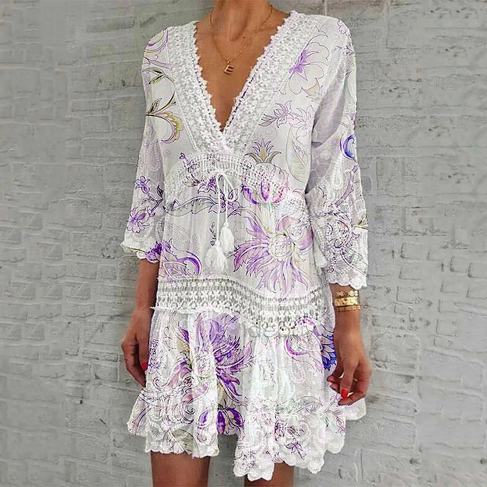 Women Fashion V NeckJjacquard Seven Quarter Sleeve Bohemian Cutout Floral Sexy Beach Dress