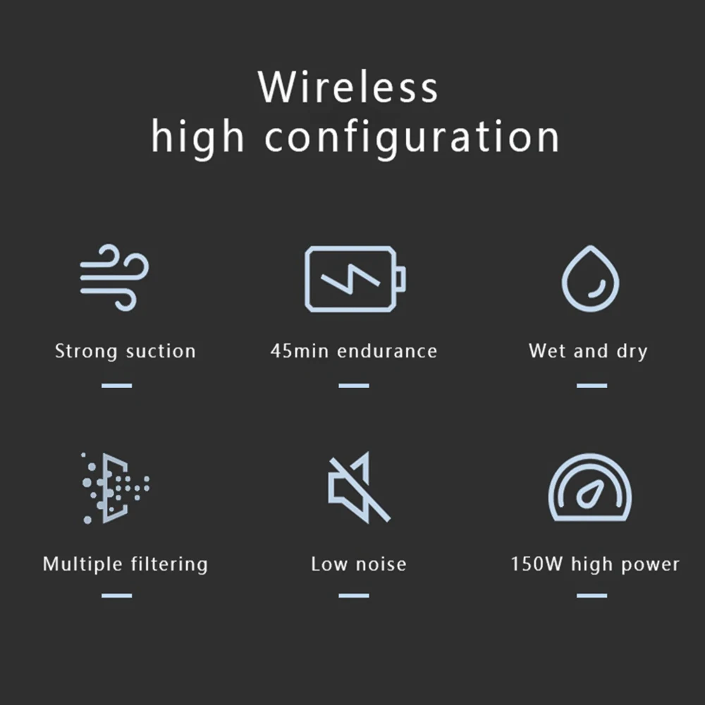 150W high-power motor, long-lasting suction, no decay and no heat, super suction can quickly absorb stubborn dust.