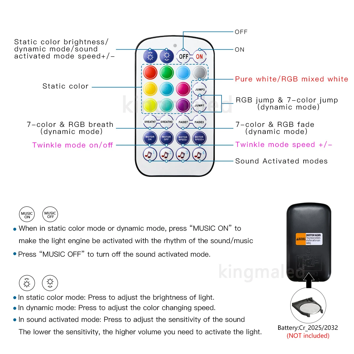 Battery of Remote : CR2025 battery ( NOT included!)