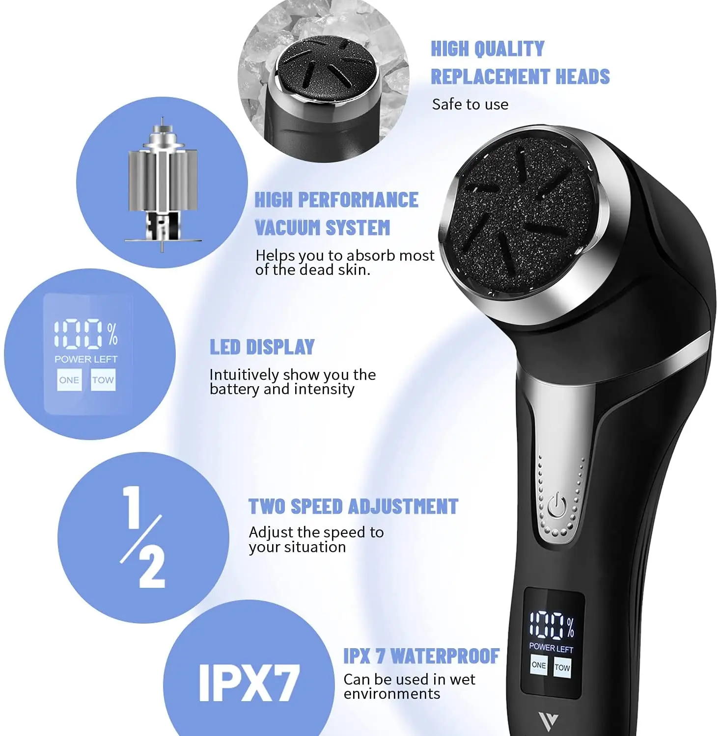 Main functions: 1. Remove dead skin calluses and keratin. 2. Vacuuming, dander collection.