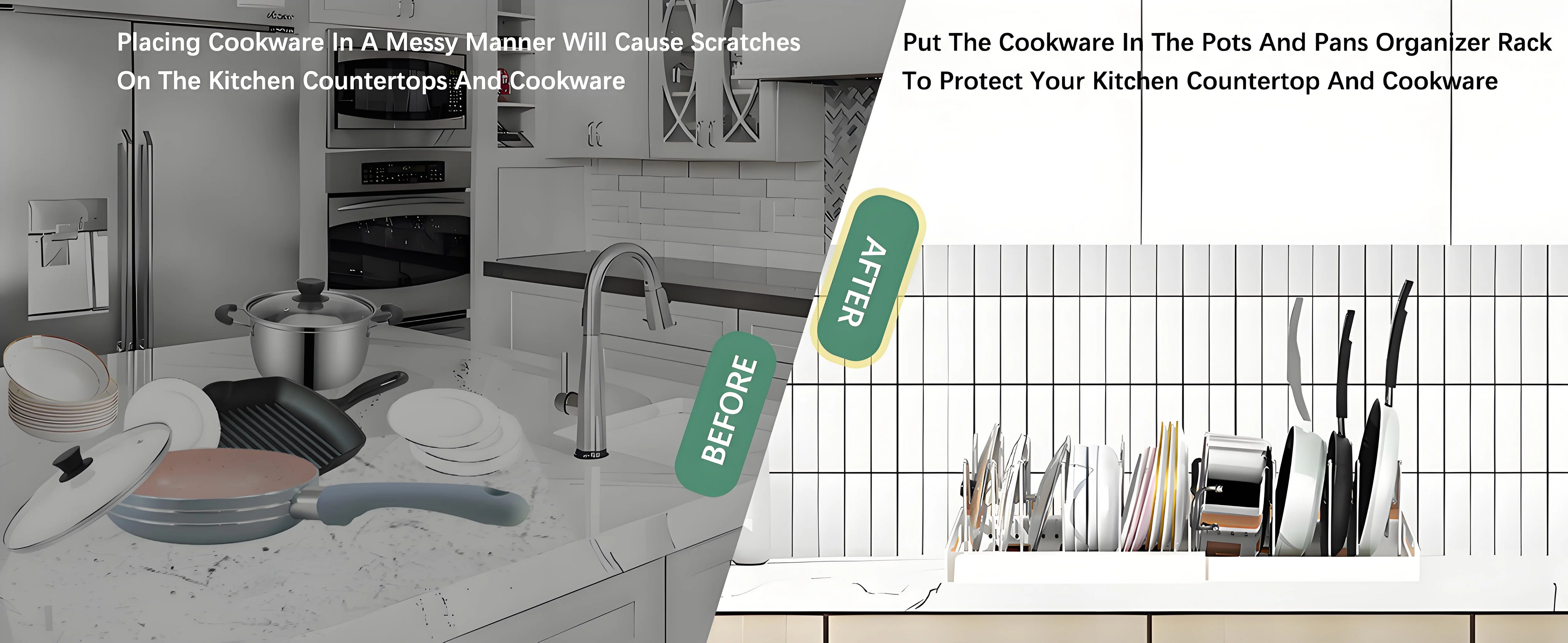 POTS AND PANS ORGANIZER – Use our pot rack organizer organize pans, lids, platters, cake molds, cutting boards cookware and bakeware in the cabinets, counter top or pantry