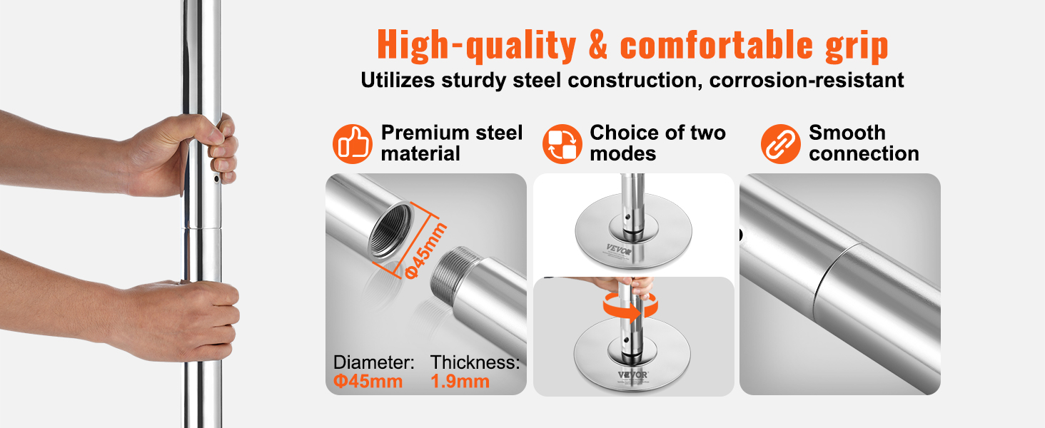 The VEVOR professional dancing pole is made from 45mm stainless steel. It has a 1.9mm thickness. It provides robust safety and durability. The pole can hold up to 200 kg (441 lbs). It features a powder-coated finish that resists rust and corrosion. It improves grip strength for better performance. The pole is built to last. You get a dependable practice and performance tool. Our 45mm diameter offers an excellent grip for all skill levels. Therefore, it is ideal for both novices and experienced users. The solid build ensures that the pole stays stable during use.