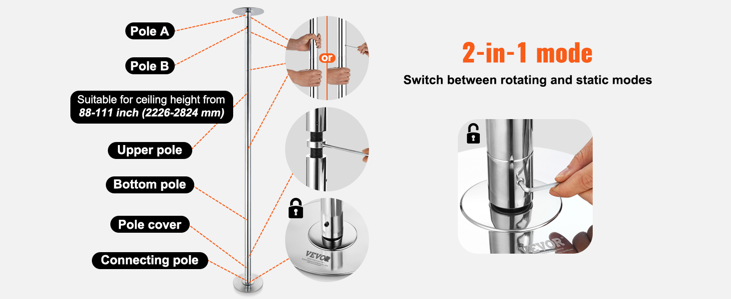 The dance pole design features two modes: rotating and static. For static mode, simply tighten the bottom screw to lock the pole, for rotating mode, loosen the bottom screw.