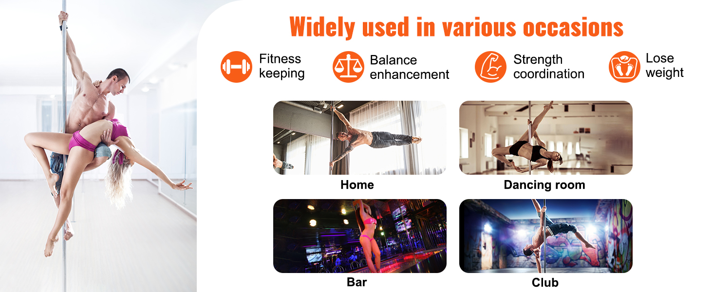 This height adjustable dance fitness pole is perfect for sports training, stage performances, homes, clubs, bars, gyms, yoga studios, or dance classrooms. It's easy to disassemble for quick transport or storage.